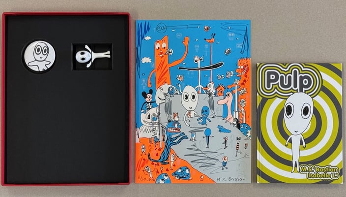Buch in signierter Vorzugsausgabe von 50 Exemplaren, 8/50, Hartplastikfigur "Pulp" und Pulp-Badge, 30 x 22 cm